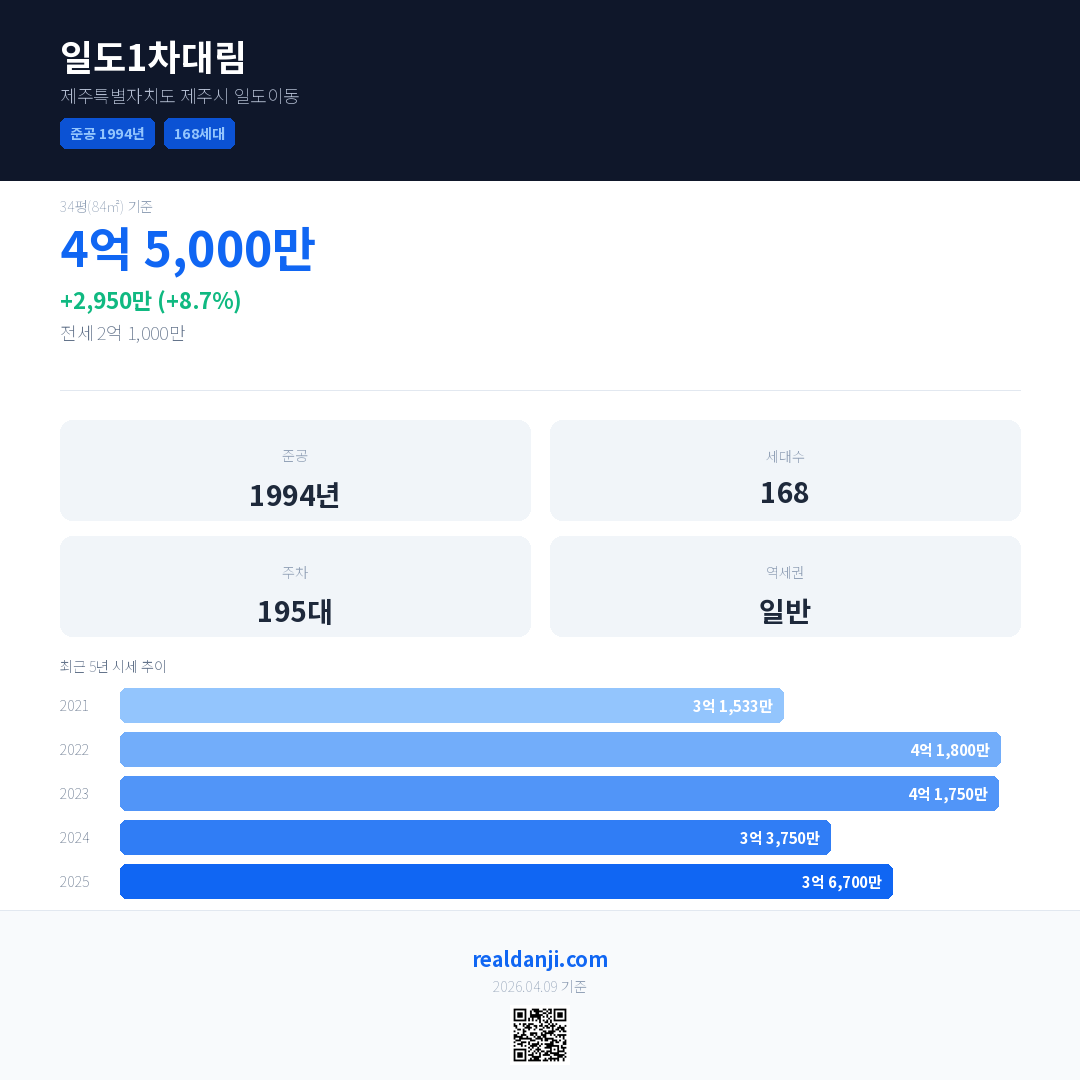 일도1차대림 국민평형 기준 2025년 평균 거래가는 3억 6,700만으로, 전년 대비 8.7% 상승 했습니다.