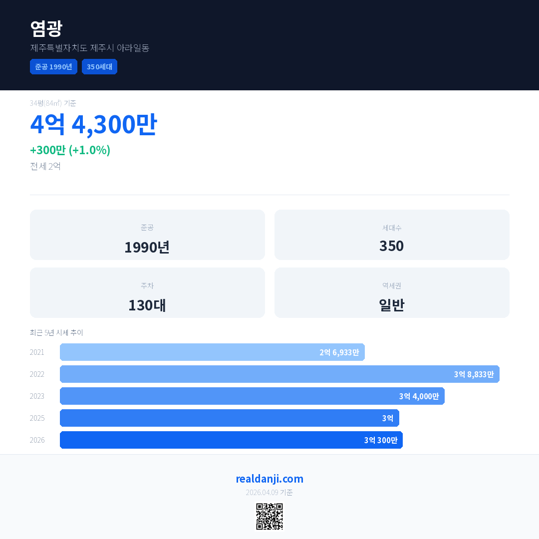 염광 국민평형 기준 2026년 평균 거래가는 3억 300만으로, 전년 대비 1.0% 상승 했습니다.