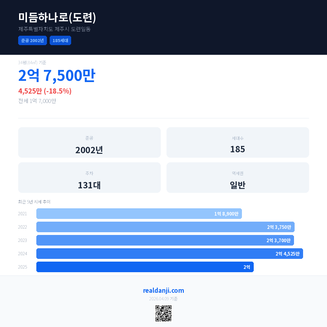 미듬하나로(도련) 국민평형 기준 2025년 평균 거래가는 2억으로, 전년 대비 18.5% 하락 했습니다.