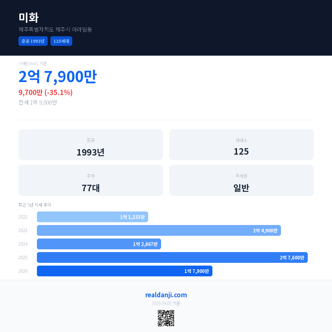 미화 국민평형 기준 2026년 평균 거래가는 1억 7,900만으로, 전년 대비 35.1% 하락 했습니다.