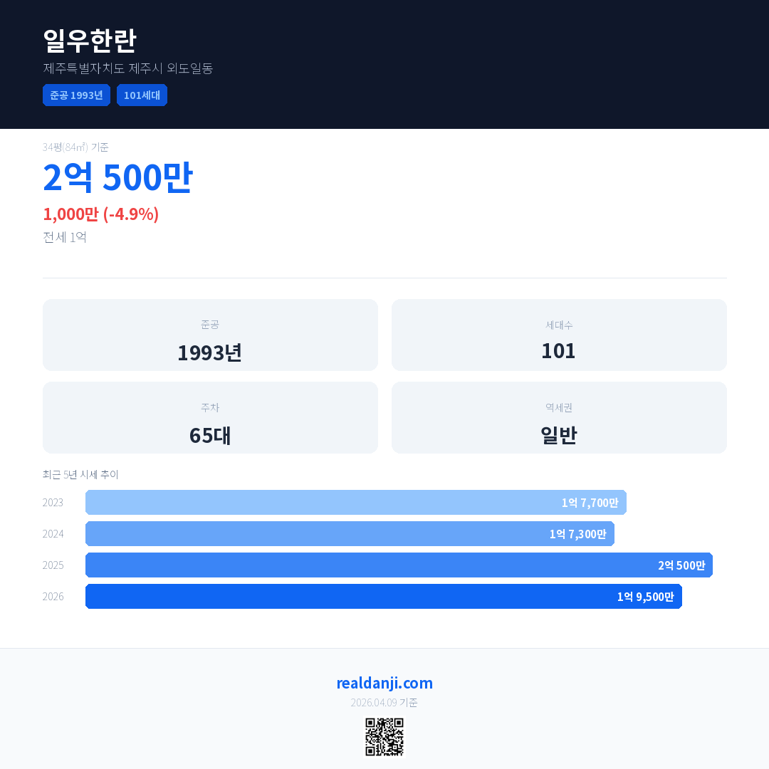 일우한란은(는) 1993년에 준공되었으며, 현재 33년차입니다. 총 101세대 규모입니다.