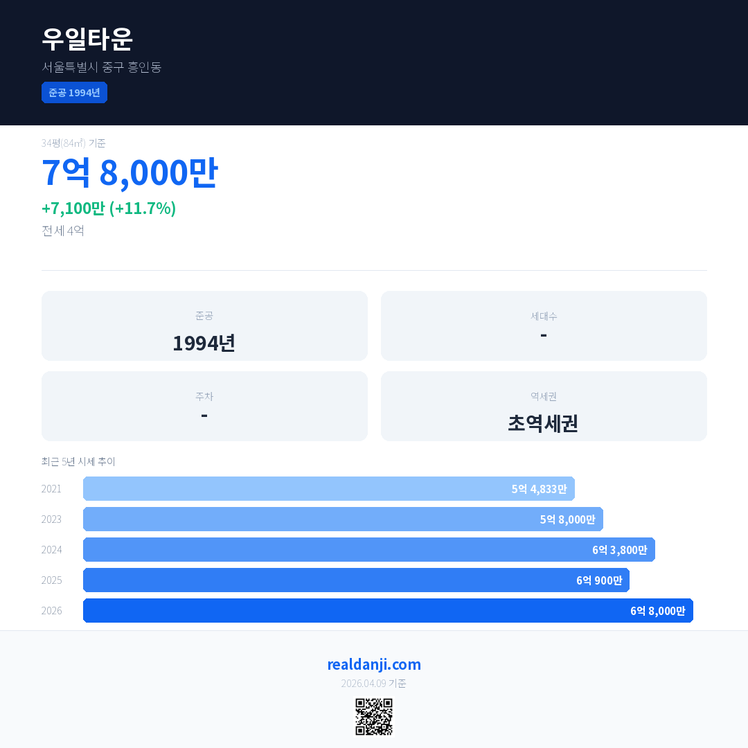 우일타운 국민평형 기준 2026년 평균 거래가는 6억 8,000만으로, 전년 대비 11.7% 상승 했습니다.