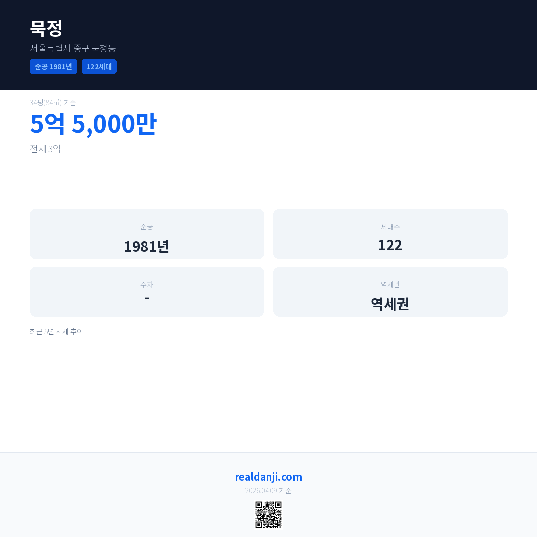 묵정은(는) 1981년에 준공되었으며, 현재 45년차입니다. 총 122세대 규모입니다.