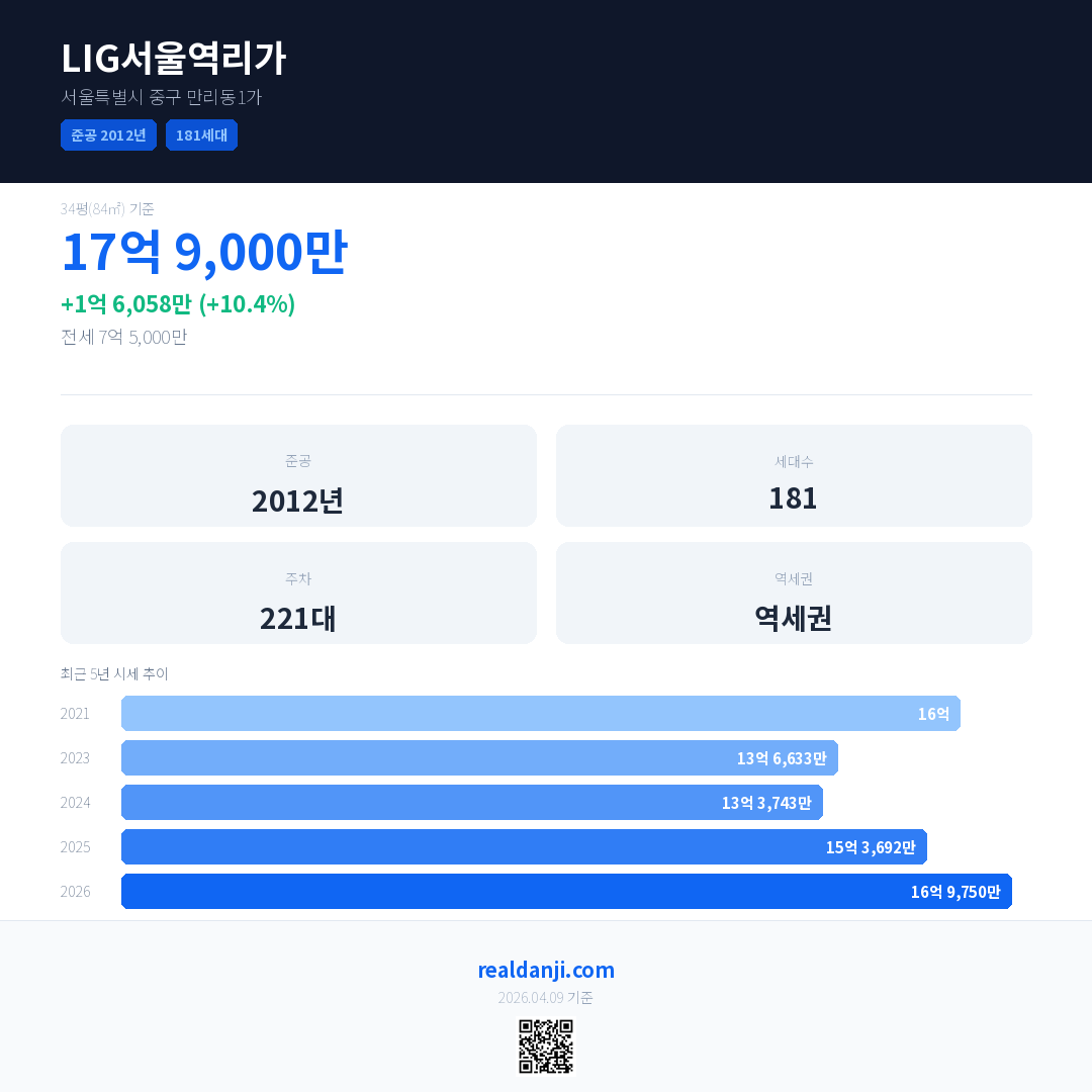 LIG서울역리가 국민평형 기준 2026년 평균 거래가는 16억 9,750만으로, 전년 대비 10.4% 상승 했습니다.