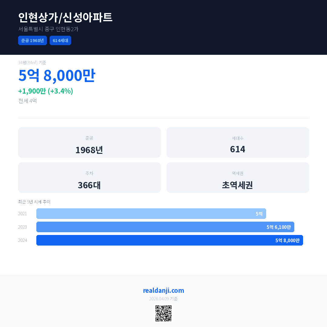 인현상가/신성아파트 최근 거래가는 5억 8,000만입니다. (2025-10)