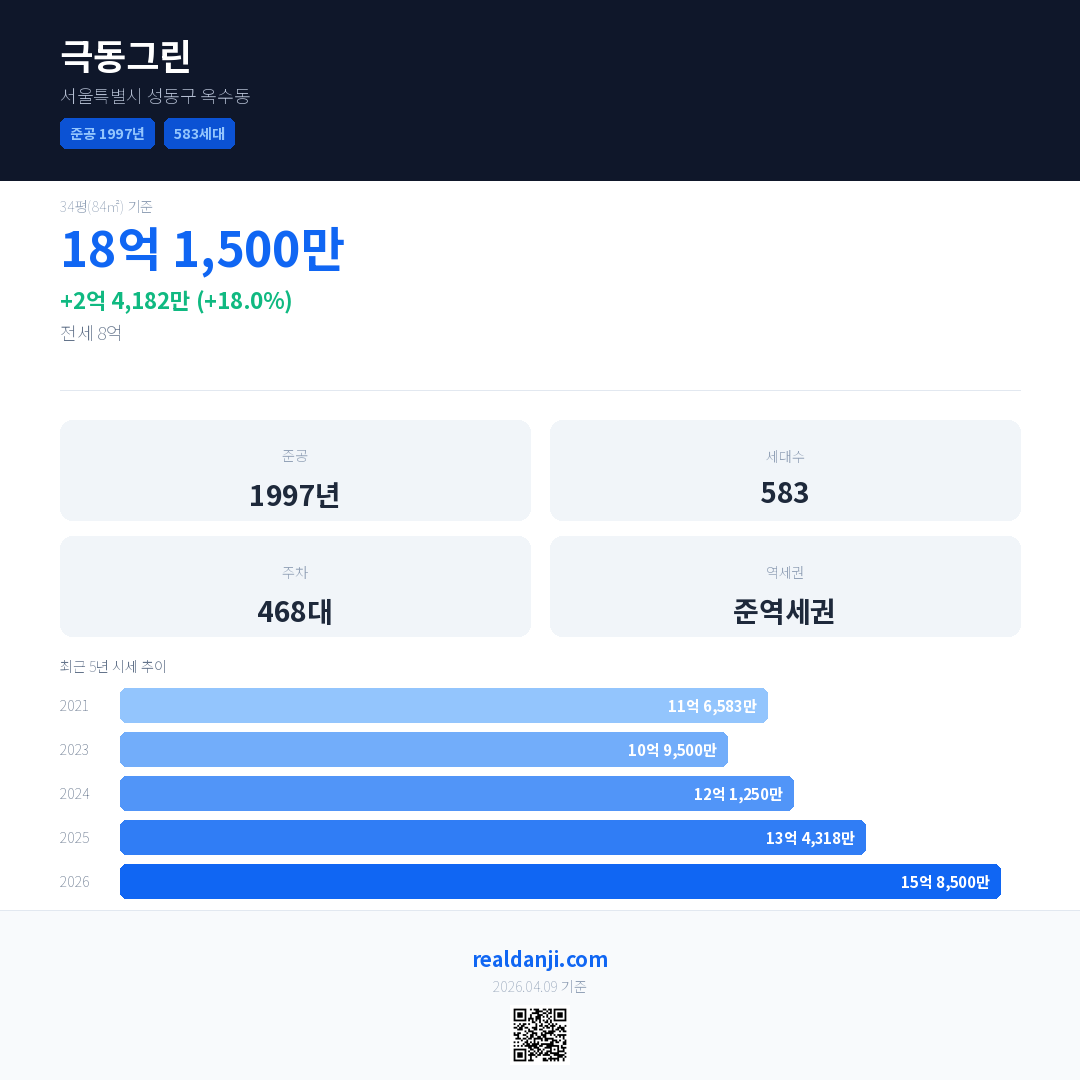 극동그린 국민평형 기준 2026년 평균 거래가는 15억 8,500만으로, 전년 대비 18.0% 상승 했습니다.