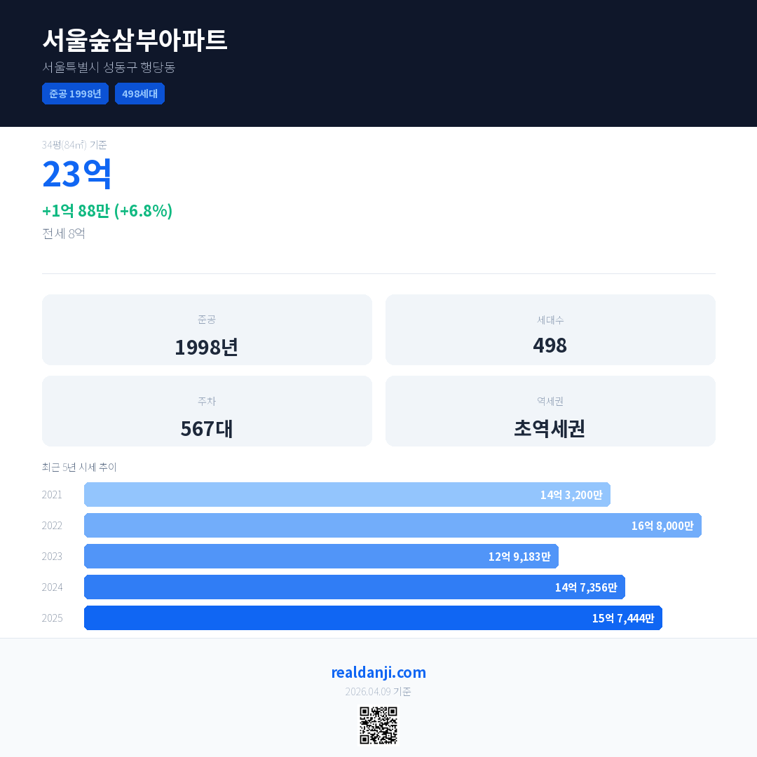 서울숲삼부아파트 최근 거래가는 23억입니다. (2026-03)