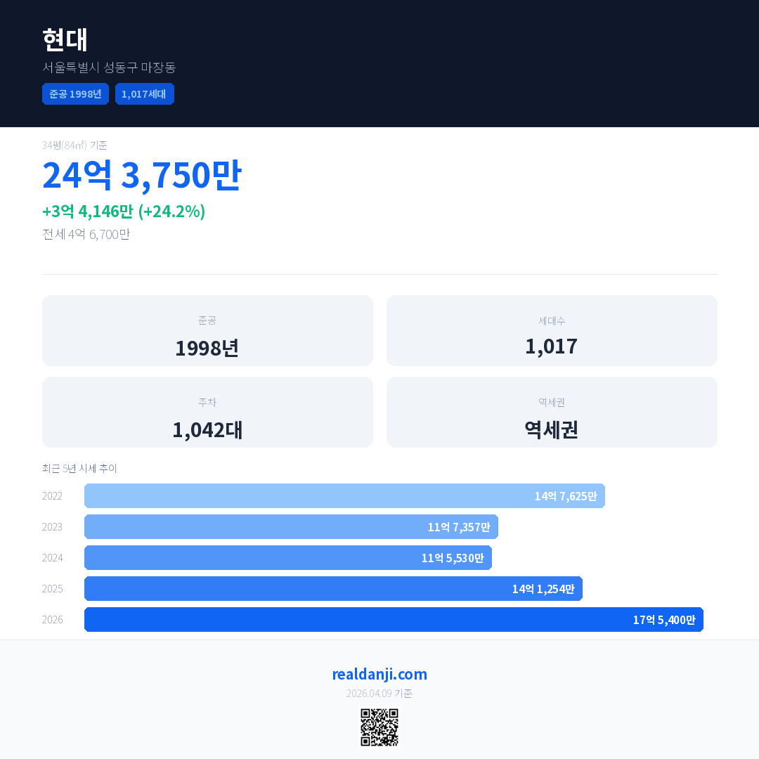 현대 국민평형 기준 2026년 평균 거래가는 17억 5,400만으로, 전년 대비 24.2% 상승 했습니다.