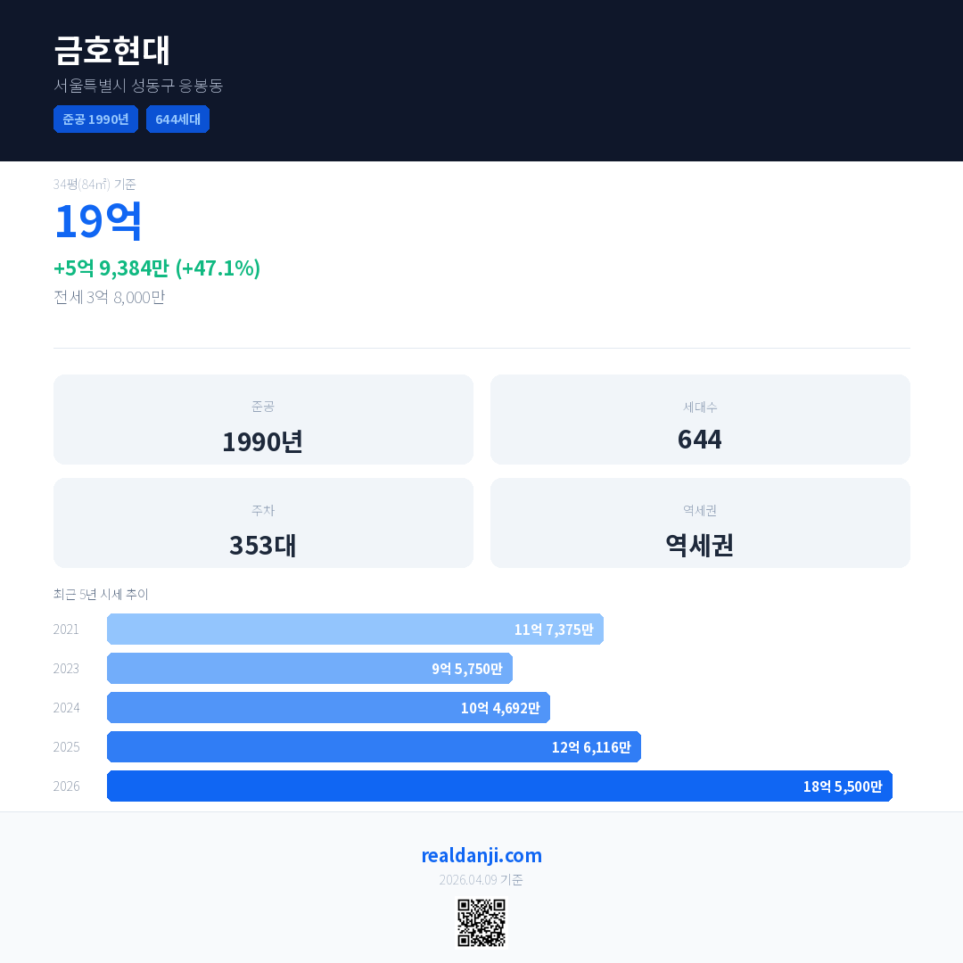 금호현대 국민평형 기준 2026년 평균 거래가는 18억 5,500만으로, 전년 대비 47.1% 상승 했습니다.