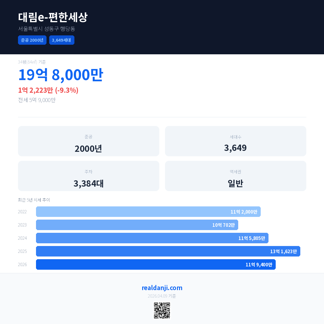대림e-편한세상 국민평형 기준 2026년 평균 거래가는 11억 9,400만으로, 전년 대비 9.3% 하락 했습니다.