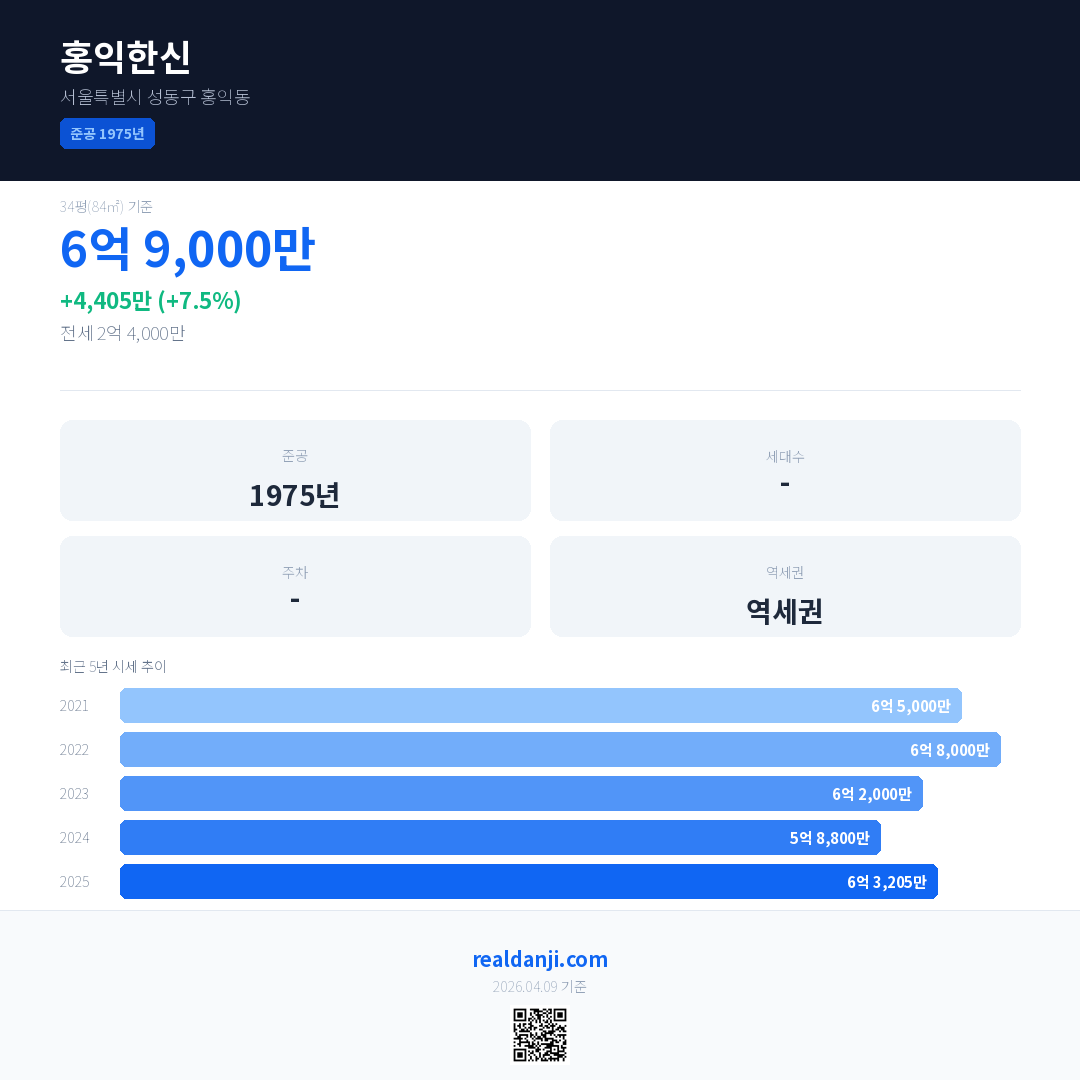 홍익한신 국민평형 기준 2025년 평균 거래가는 6억 3,205만으로, 전년 대비 7.5% 상승 했습니다.