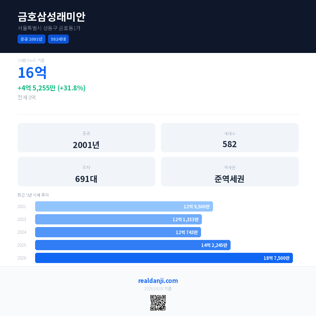 금호삼성래미안은(는) 2001년에 준공되었으며, 현재 25년차입니다. 총 582세대 규모입니다.