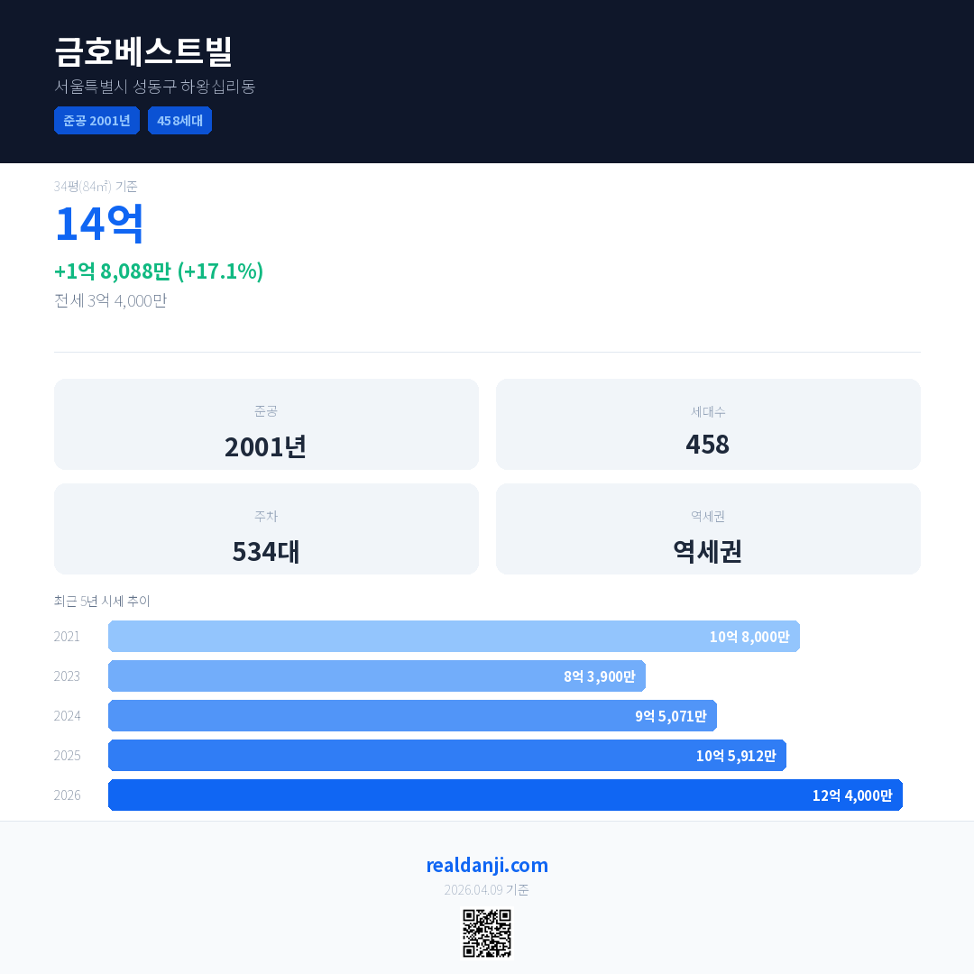 금호베스트빌 국민평형 기준 2026년 평균 거래가는 12억 4,000만으로, 전년 대비 17.1% 상승 했습니다.