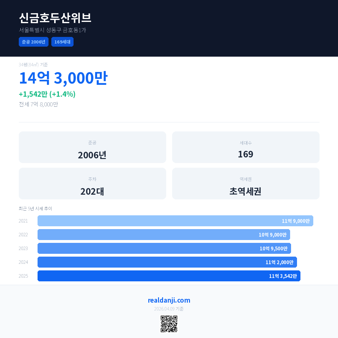 신금호두산위브은(는) 2006년에 준공되었으며, 현재 20년차입니다. 총 169세대 규모입니다.