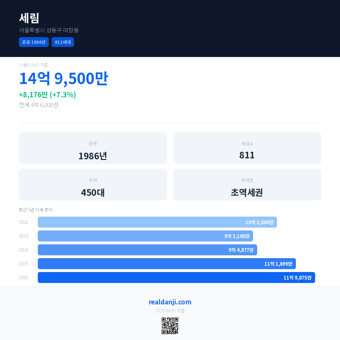 세림은(는) 1986년에 준공되었으며, 현재 40년차입니다. 총 811세대 규모입니다.