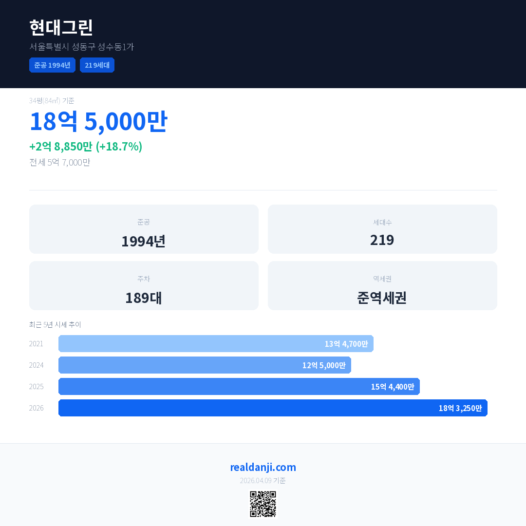 현대그린 국민평형 기준 2026년 평균 거래가는 18억 3,250만으로, 전년 대비 18.7% 상승 했습니다.