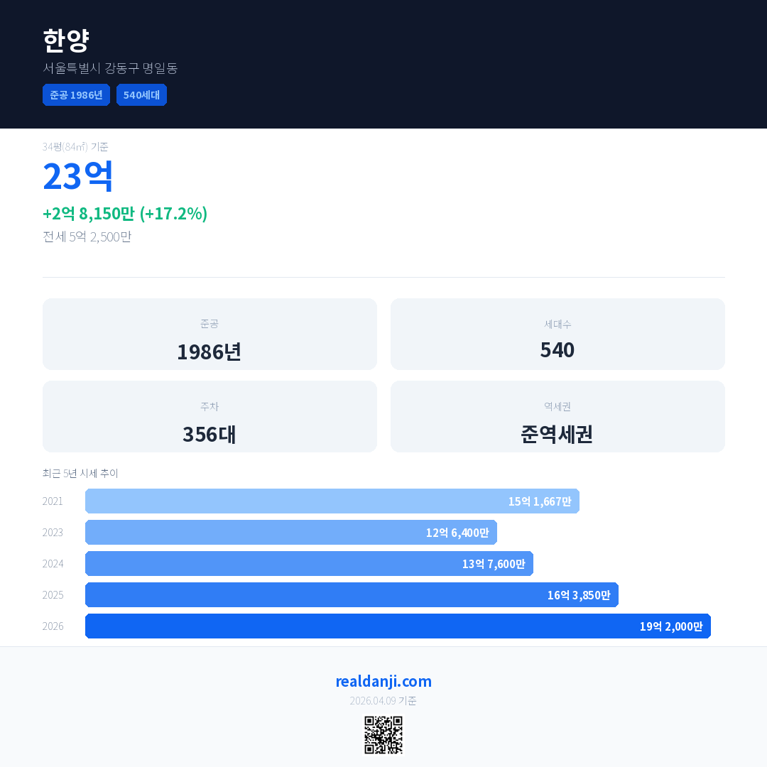 한양 국민평형 기준 2026년 평균 거래가는 19억 2,000만으로, 전년 대비 17.2% 상승 했습니다.
