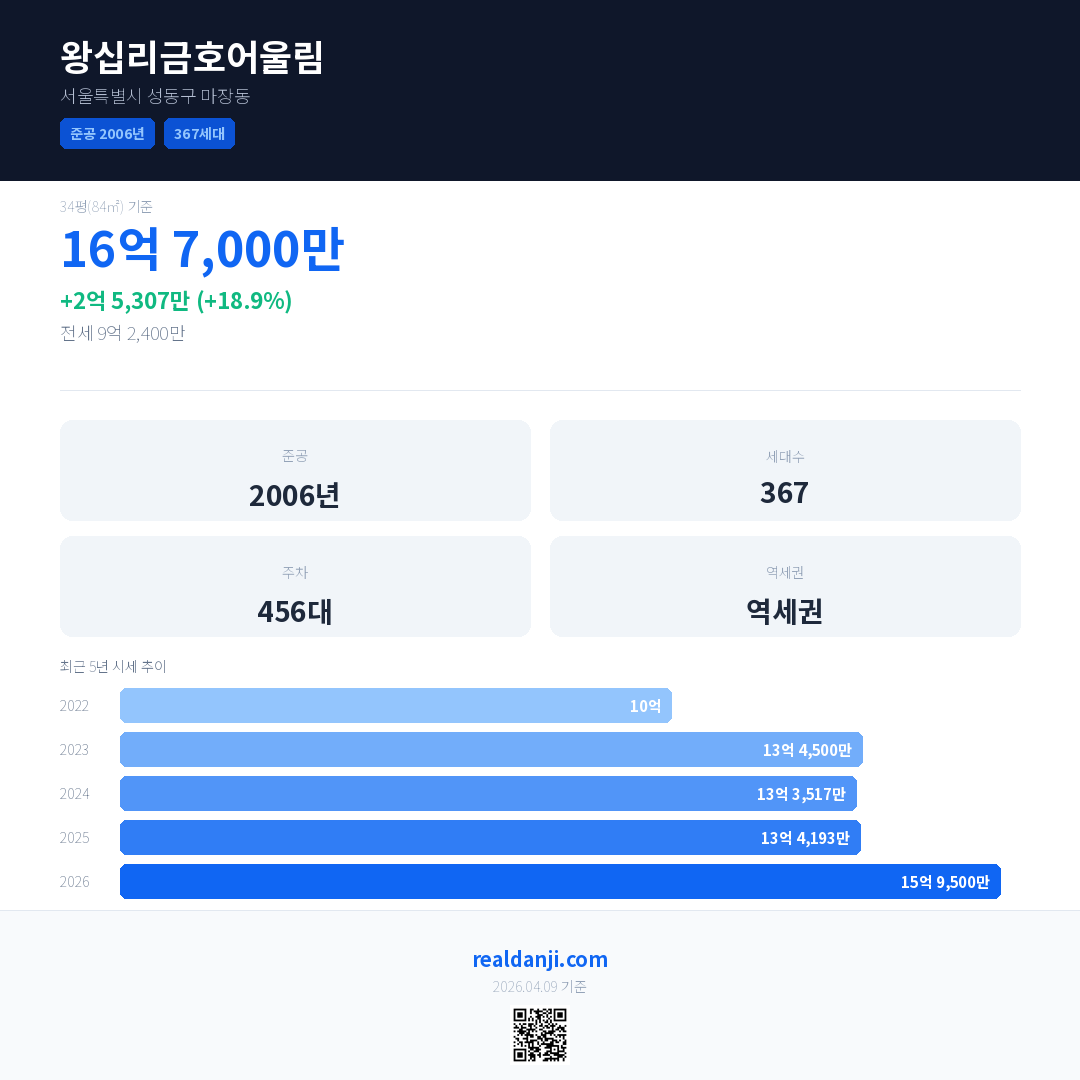 왕십리금호어울림 국민평형 기준 2026년 평균 거래가는 15억 9,500만으로, 전년 대비 18.9% 상승 했습니다.