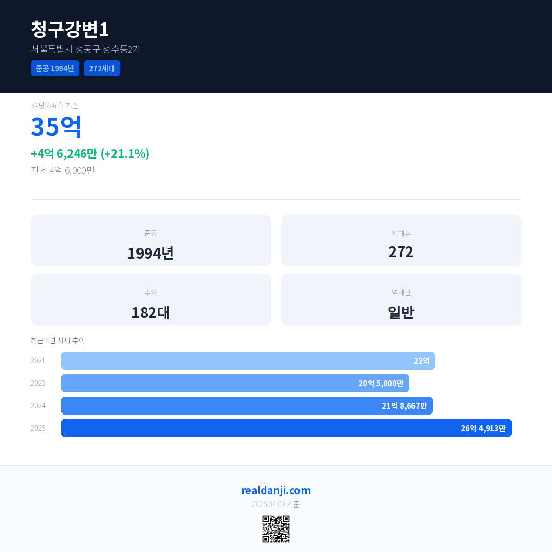 청구강변1 국민평형 기준 2025년 평균 거래가는 26억 4,913만으로, 전년 대비 21.1% 상승 했습니다.