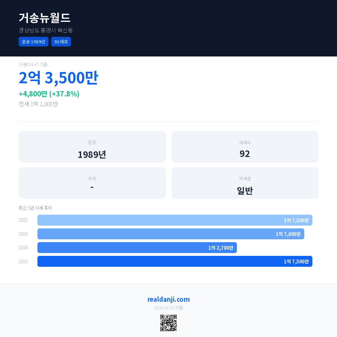 거송뉴월드 국민평형 기준 2025년 평균 거래가는 1억 7,500만으로, 전년 대비 37.8% 상승 했습니다.