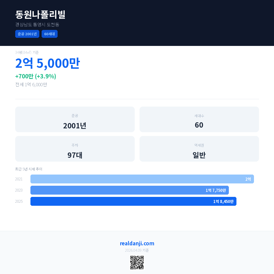 동원나폴리빌 국민평형 기준 2025년 평균 거래가는 1억 8,450만으로, 전년 대비 3.9% 상승 했습니다.