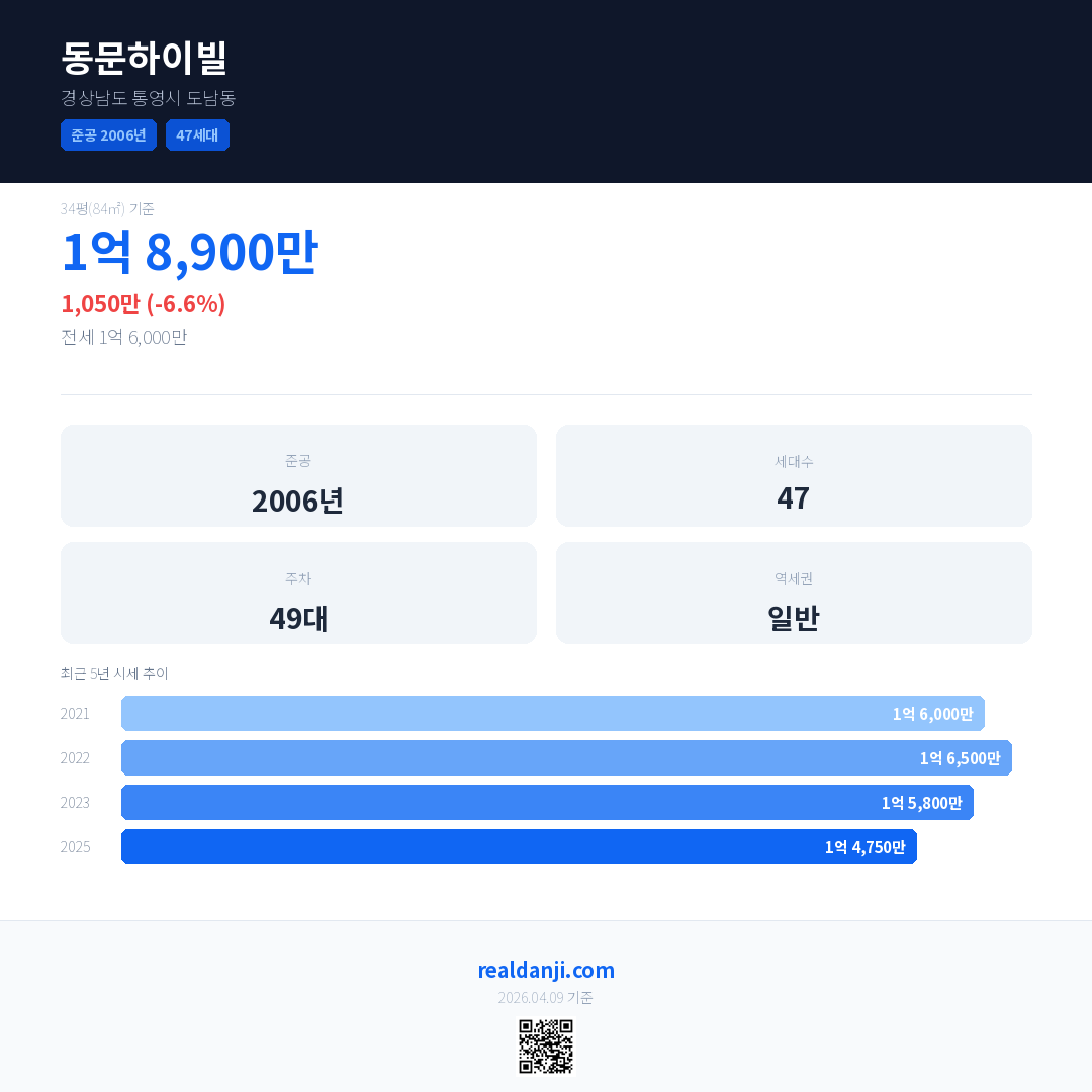 동문하이빌 최근 거래가는 1억 8,900만입니다. (2025-08)