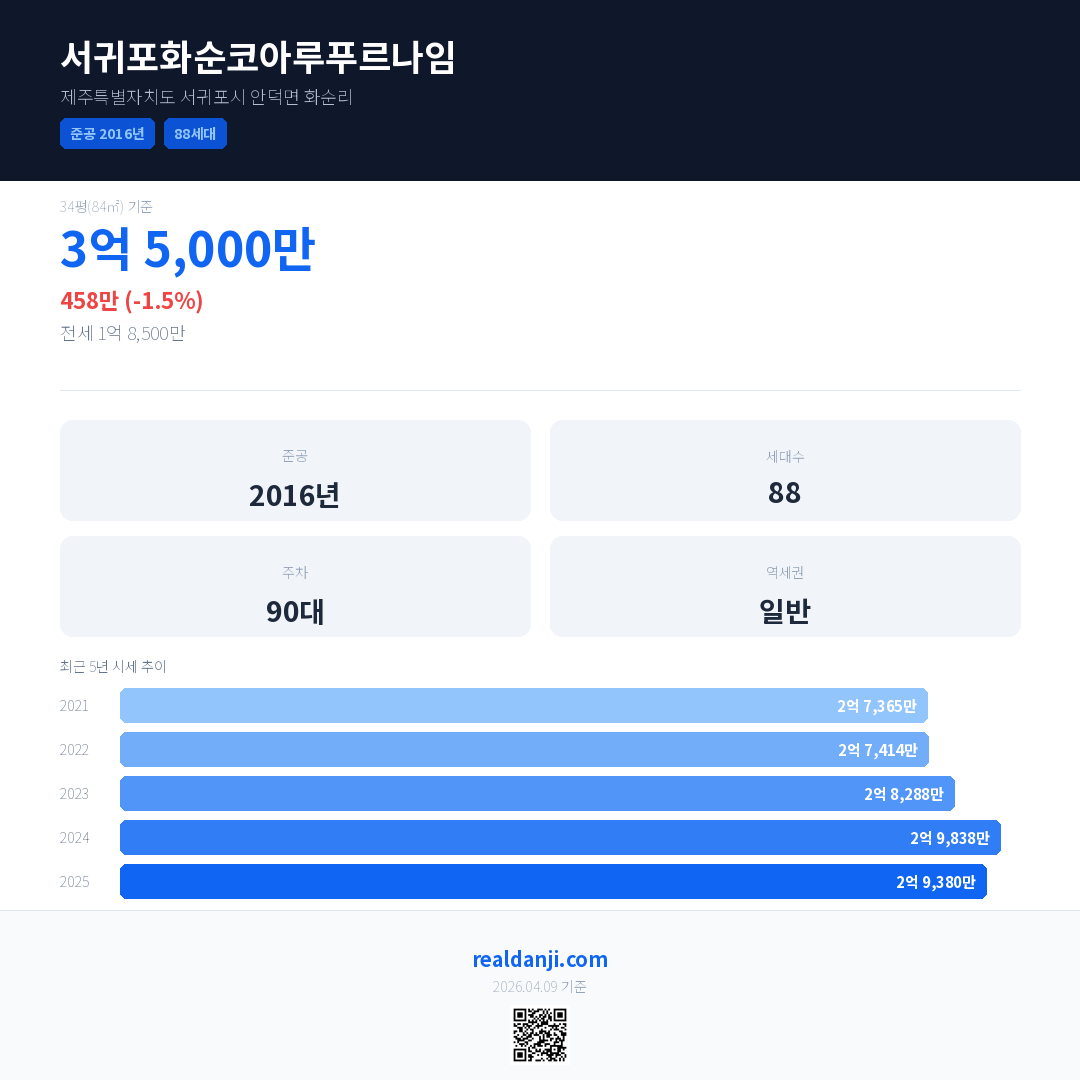 서귀포화순코아루푸르나임 최근 거래가는 3억 5,000만입니다. (2025-11)