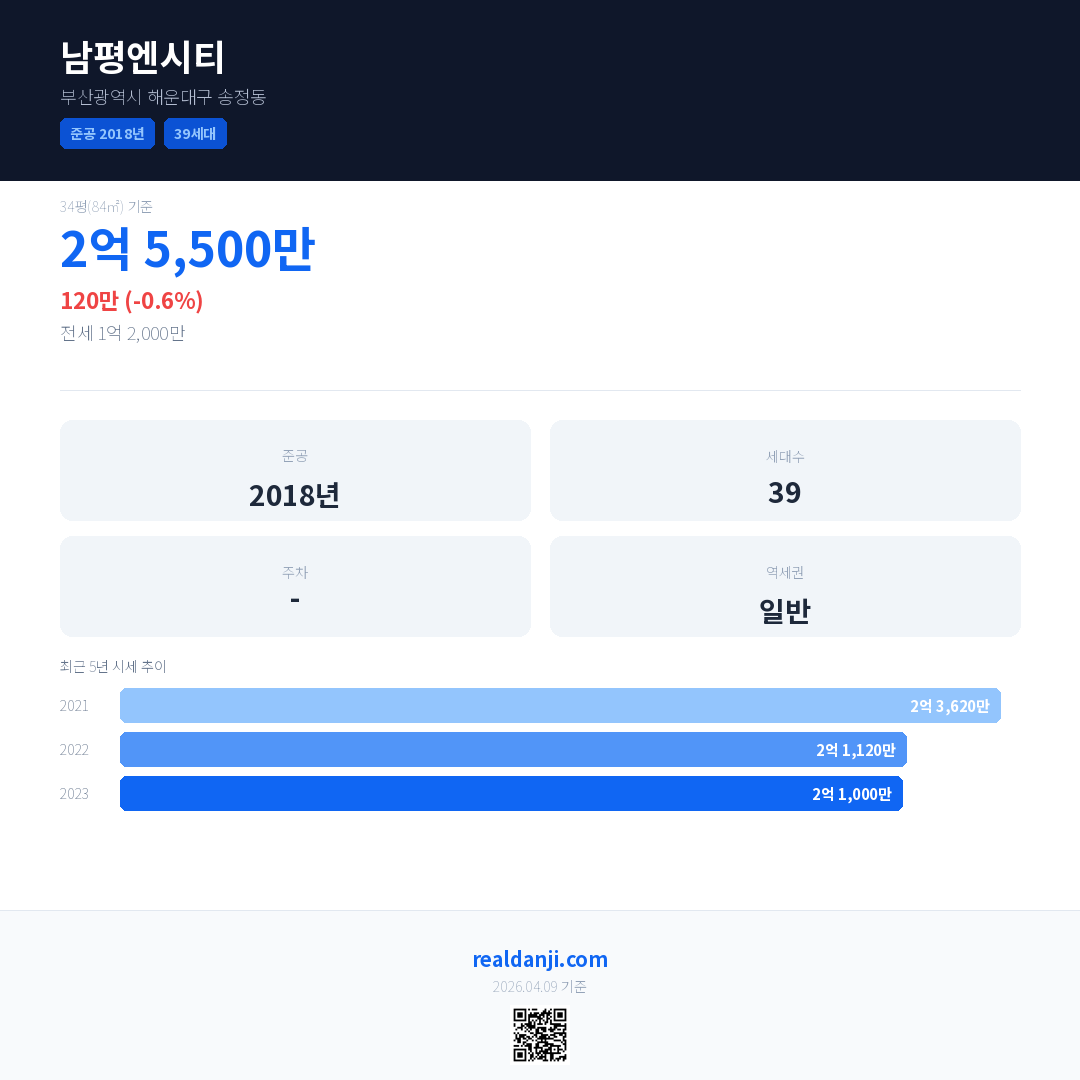남평엔시티은(는) 2018년에 준공되었으며, 현재 8년차입니다. 총 39세대 규모입니다.