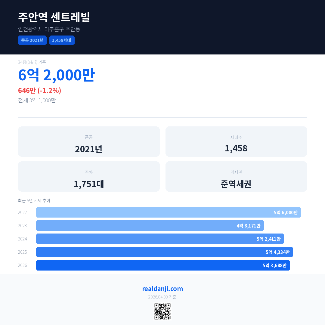 주안역 센트레빌은(는) 2021년에 준공되었으며, 현재 5년차입니다. 총 1,458세대 규모입니다.