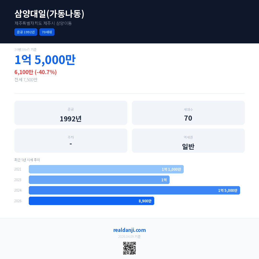 삼양대일(가동나동) 국민평형 기준 2026년 평균 거래가는 8,900만으로, 전년 대비 40.7% 하락 했습니다.