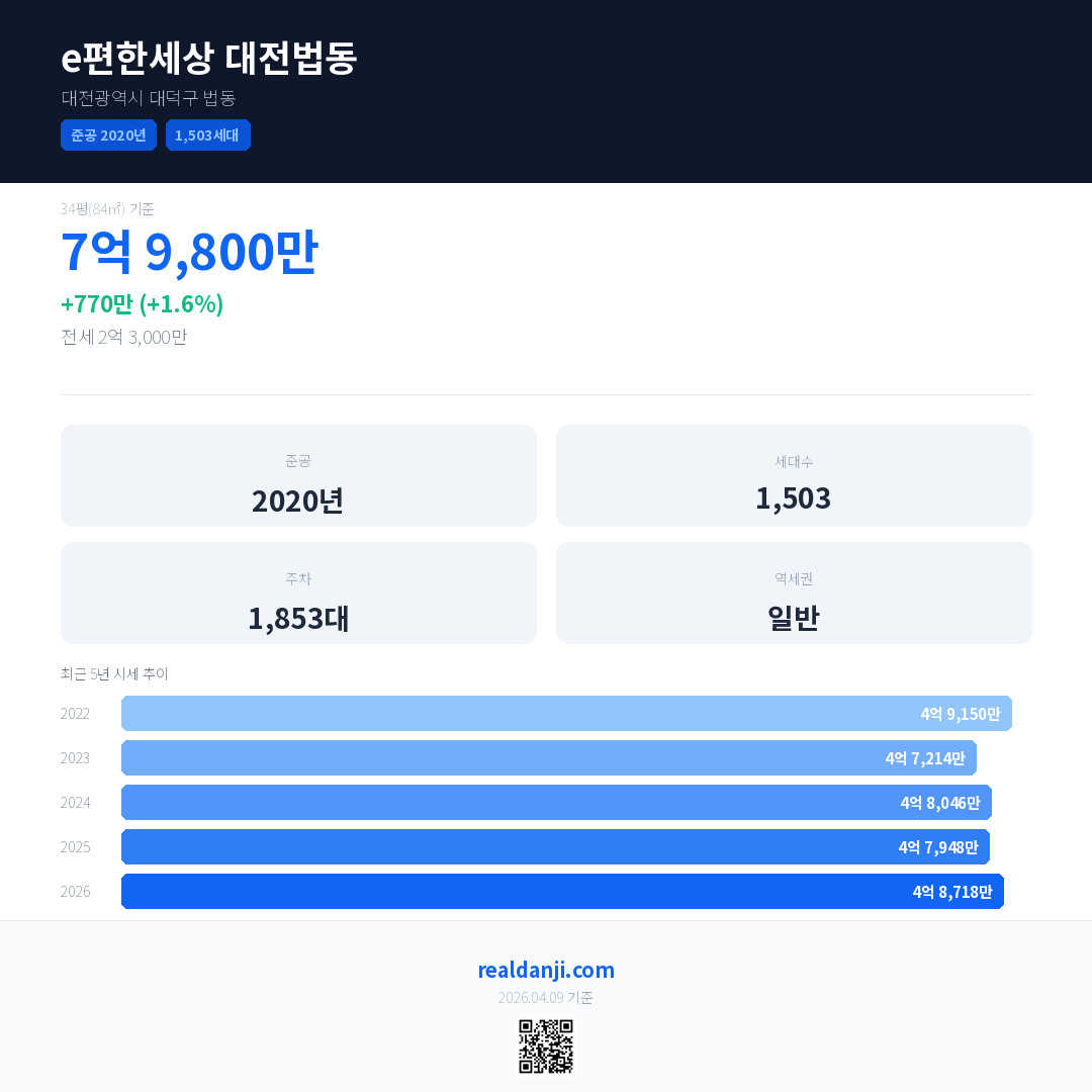 e편한세상 대전법동은(는) 2020년에 준공되었으며, 현재 6년차입니다. 총 1,503세대 규모입니다.