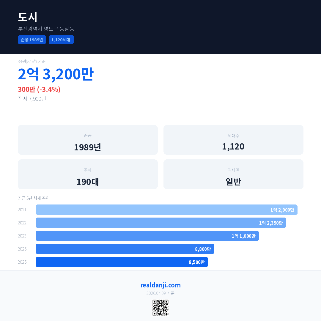 도시 국민평형 기준 2026년 평균 거래가는 8,500만으로, 전년 대비 3.4% 하락 했습니다.
