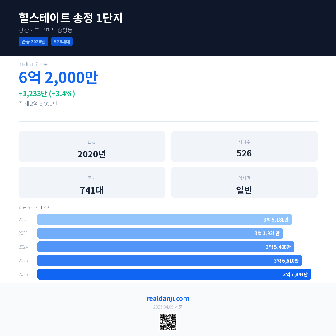 힐스테이트 송정 1단지 최근 거래가는 6억 2,000만입니다. (2026-04)