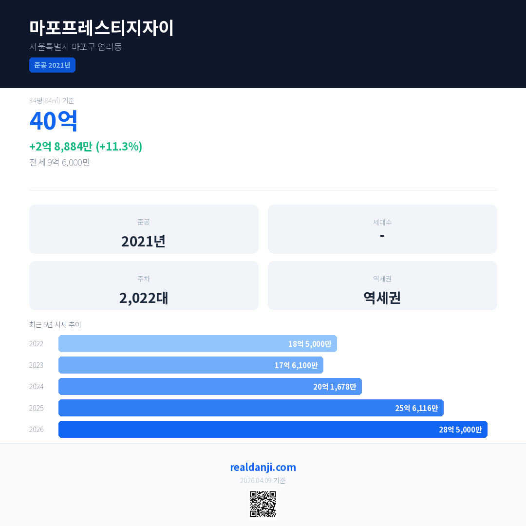 마포프레스티지자이은(는) 2021년에 준공되었으며, 현재 5년차입니다.