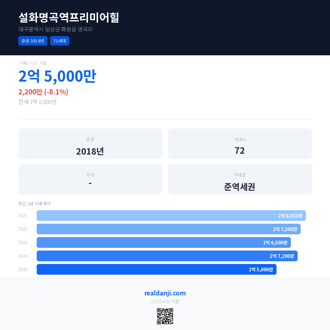 설화명곡역프리미어힐 국민평형 기준 2025년 평균 거래가는 2억 5,000만으로, 전년 대비 8.1% 하락 했습니다.