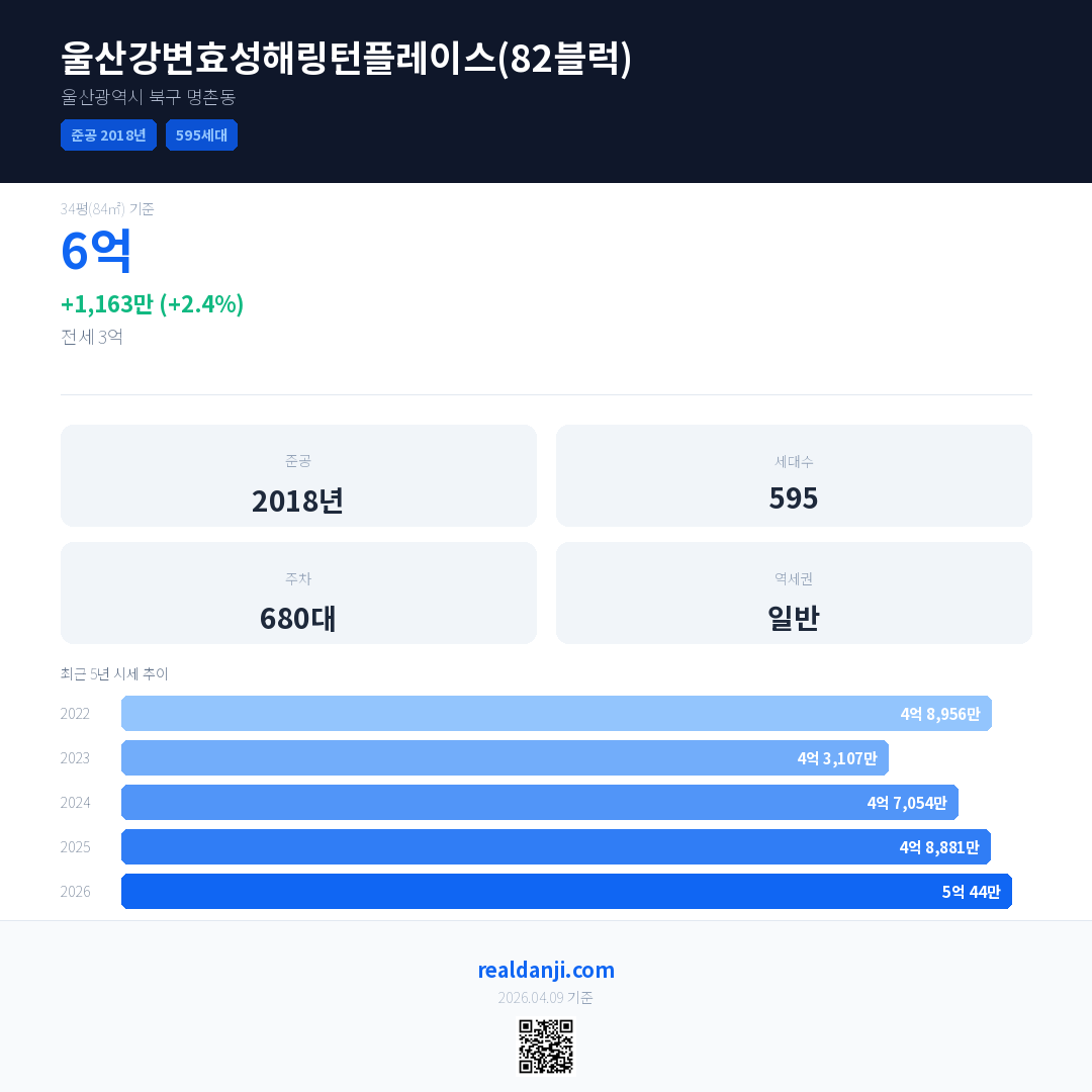 울산강변효성해링턴플레이스(82블럭) 최근 거래가는 6억입니다. (2026-03)