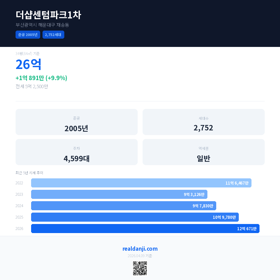 더샵센텀파크1차 국민평형 기준 2026년 평균 거래가는 12억 671만으로, 전년 대비 9.9% 상승 했습니다.