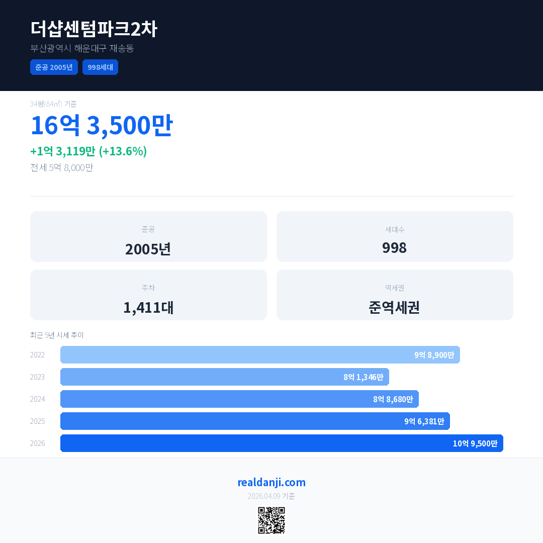 더샵센텀파크2차 최근 거래가는 16억 3,500만입니다. (2026-02)