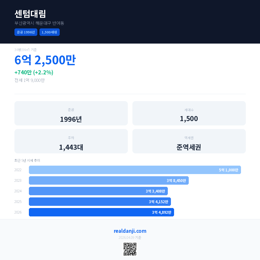 센텀대림 국민평형 기준 2026년 평균 거래가는 3억 4,892만으로, 전년 대비 2.2% 상승 했습니다.