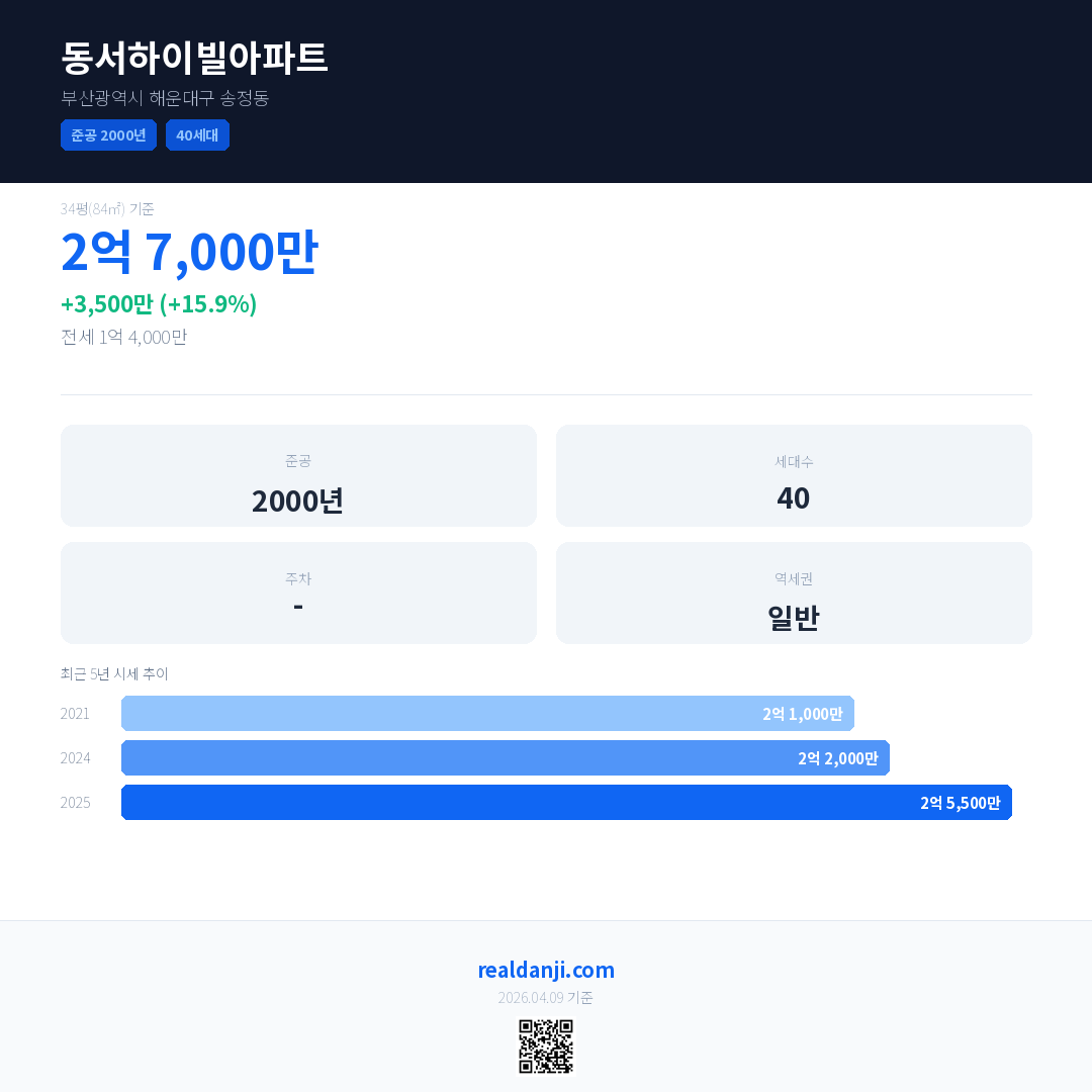 동서하이빌아파트 최근 거래가는 2억 7,000만입니다. (2025-11)
