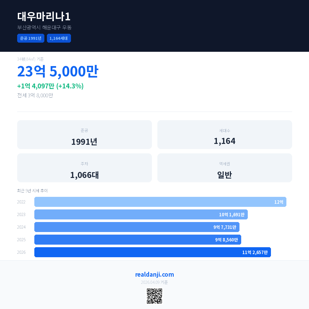 대우마리나1 최근 거래가는 23억 5,000만입니다. (2026-03)