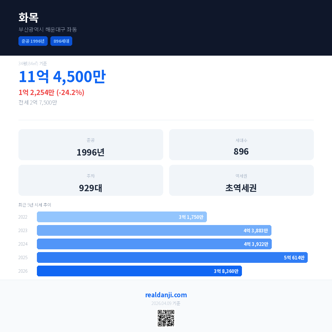 화목 국민평형 기준 2026년 평균 거래가는 3억 8,360만으로, 전년 대비 24.2% 하락 했습니다.