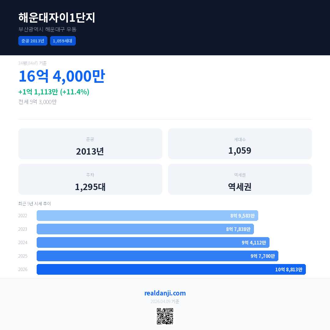 해운대자이1단지 국민평형 기준 2026년 평균 거래가는 10억 8,813만으로, 전년 대비 11.4% 상승 했습니다.