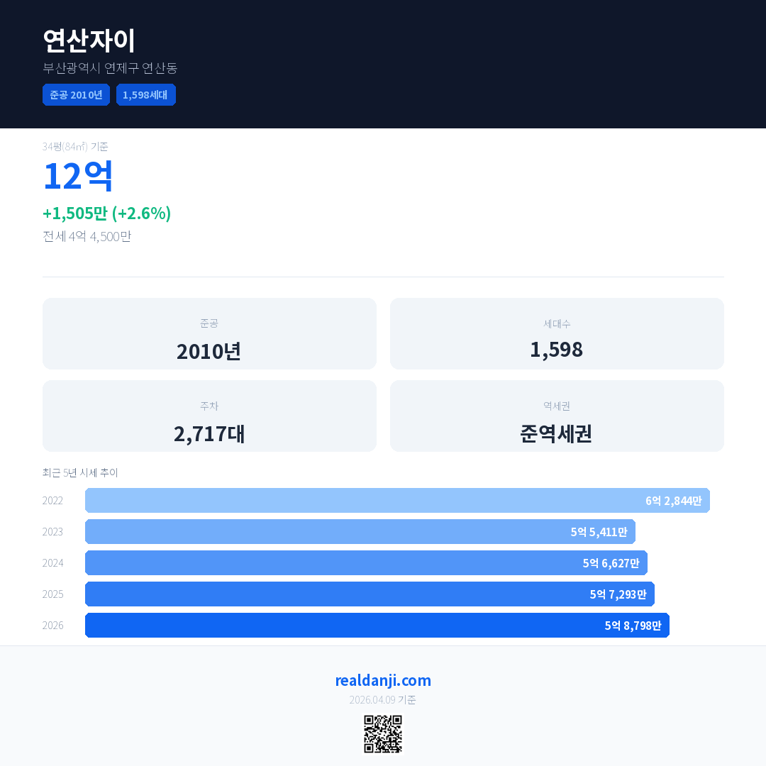 연산자이 국민평형 기준 2026년 평균 거래가는 5억 8,798만으로, 전년 대비 2.6% 상승 했습니다.