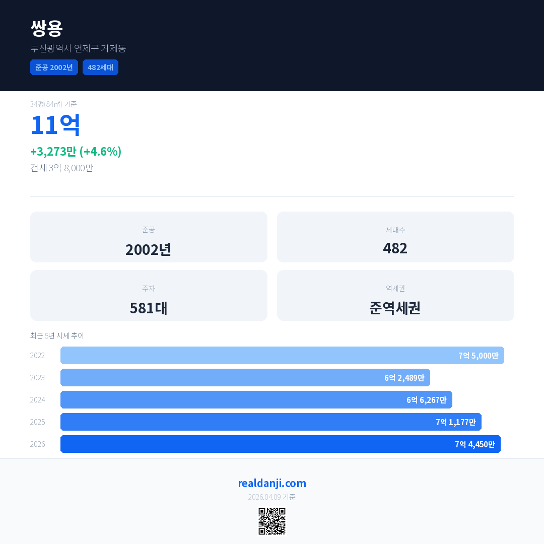쌍용 국민평형 기준 2026년 평균 거래가는 7억 4,450만으로, 전년 대비 4.6% 상승 했습니다.