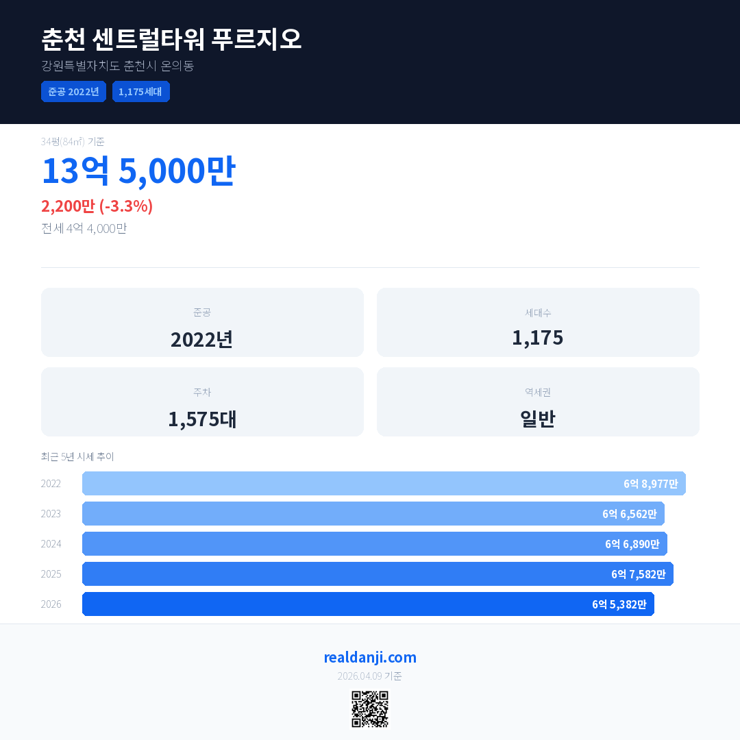 춘천 센트럴타워 푸르지오 최근 거래가는 13억 5,000만입니다. (2026-03)