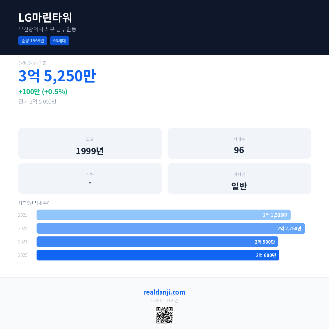 LG마린타워 국민평형 기준 2025년 평균 거래가는 2억 600만으로, 전년 대비 0.5% 상승 했습니다.