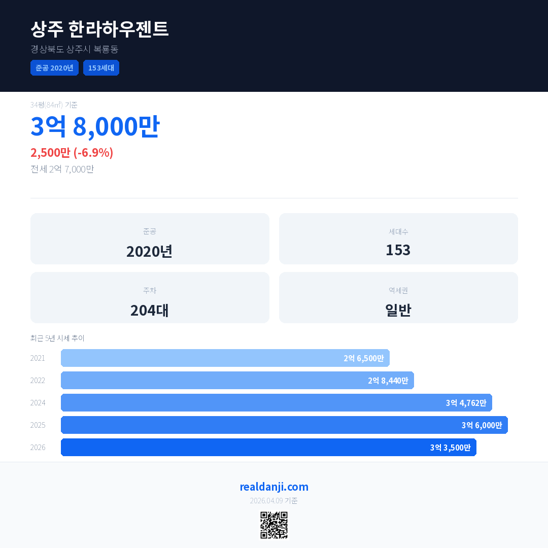 상주 한라하우젠트 국민평형 기준 2026년 평균 거래가는 3억 3,500만으로, 전년 대비 6.9% 하락 했습니다.