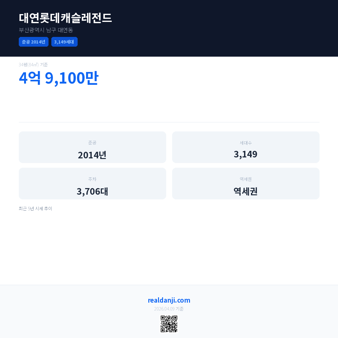 대연롯데캐슬레전드은(는) 2014년에 준공되었으며, 현재 12년차입니다. 총 3,149세대 규모입니다.