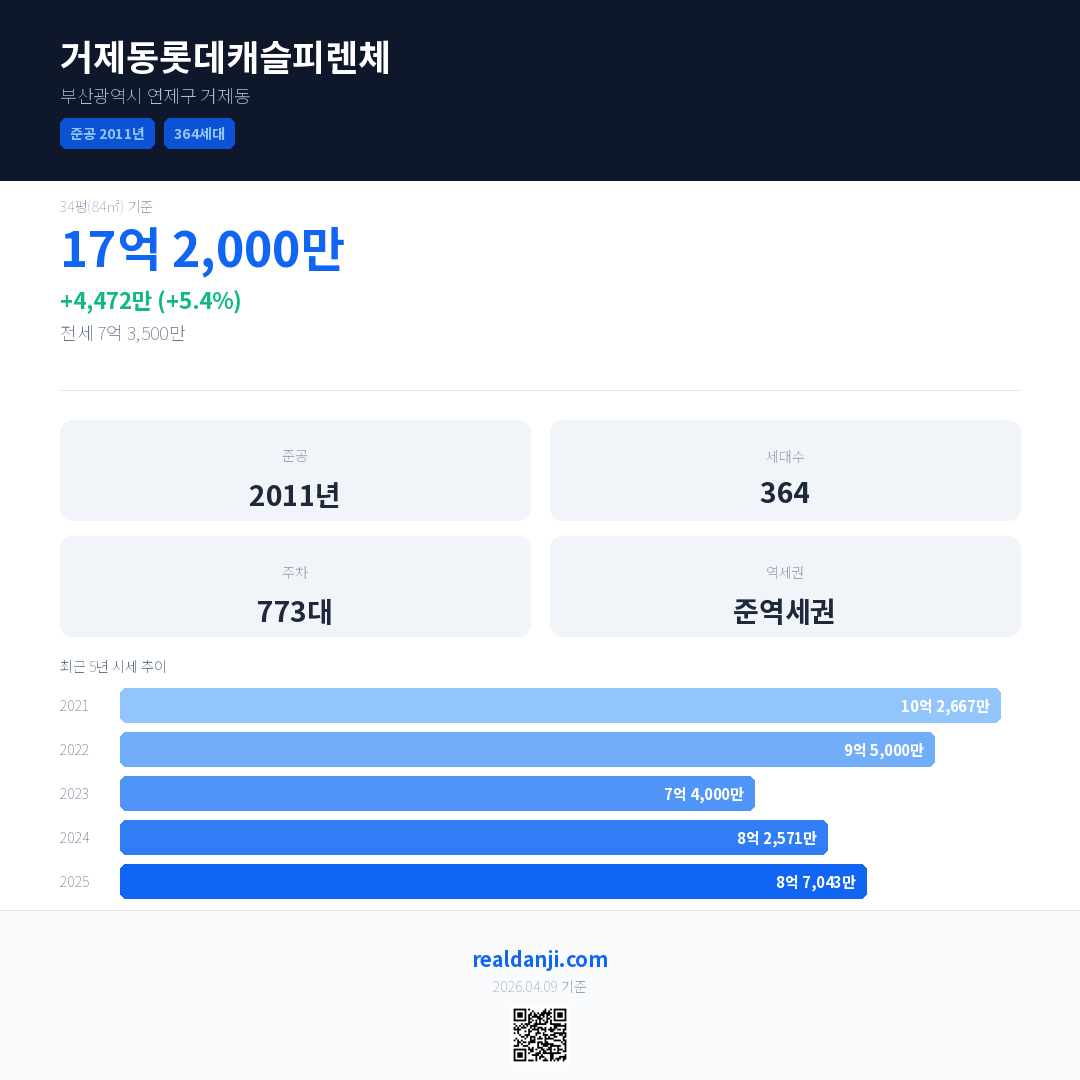 거제동롯데캐슬피렌체 국민평형 기준 2025년 평균 거래가는 8억 7,043만으로, 전년 대비 5.4% 상승 했습니다.